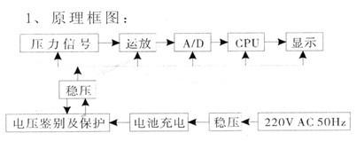 a壓力:被測介質(zhì)從引壓管施加壓力于固態(tài)(硅膜片)傳感器上,當(dāng)壓力變化時(shí),擴(kuò)散硅膜片的電阻地壓力電阻效應(yīng)下發(fā)生變化,這個(gè)變化作為電信號被檢測出來,通過線路將其轉(zhuǎn)換為與壓力成比例關(guān)系的電壓信號,該信號經(jīng)模擬——數(shù)字轉(zhuǎn)換器轉(zhuǎn)換為數(shù)字信號,經(jīng)微處理器處理后,在LCD顯示器上顯示出被檢介質(zhì)壓力值的數(shù)字。